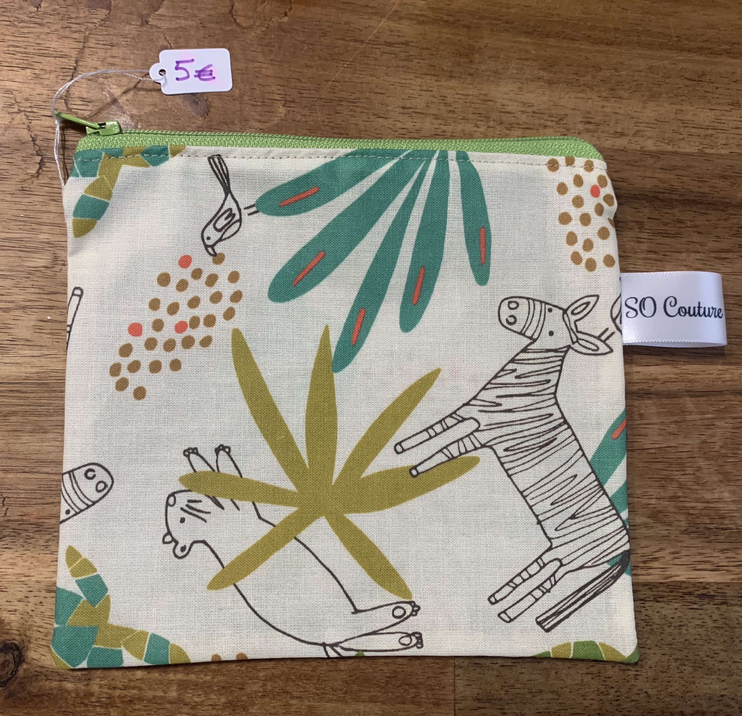Trousse en coton enduit motif animaux savane sur fond beige, fermeture éclair verte. Environ 14 / 15 cm