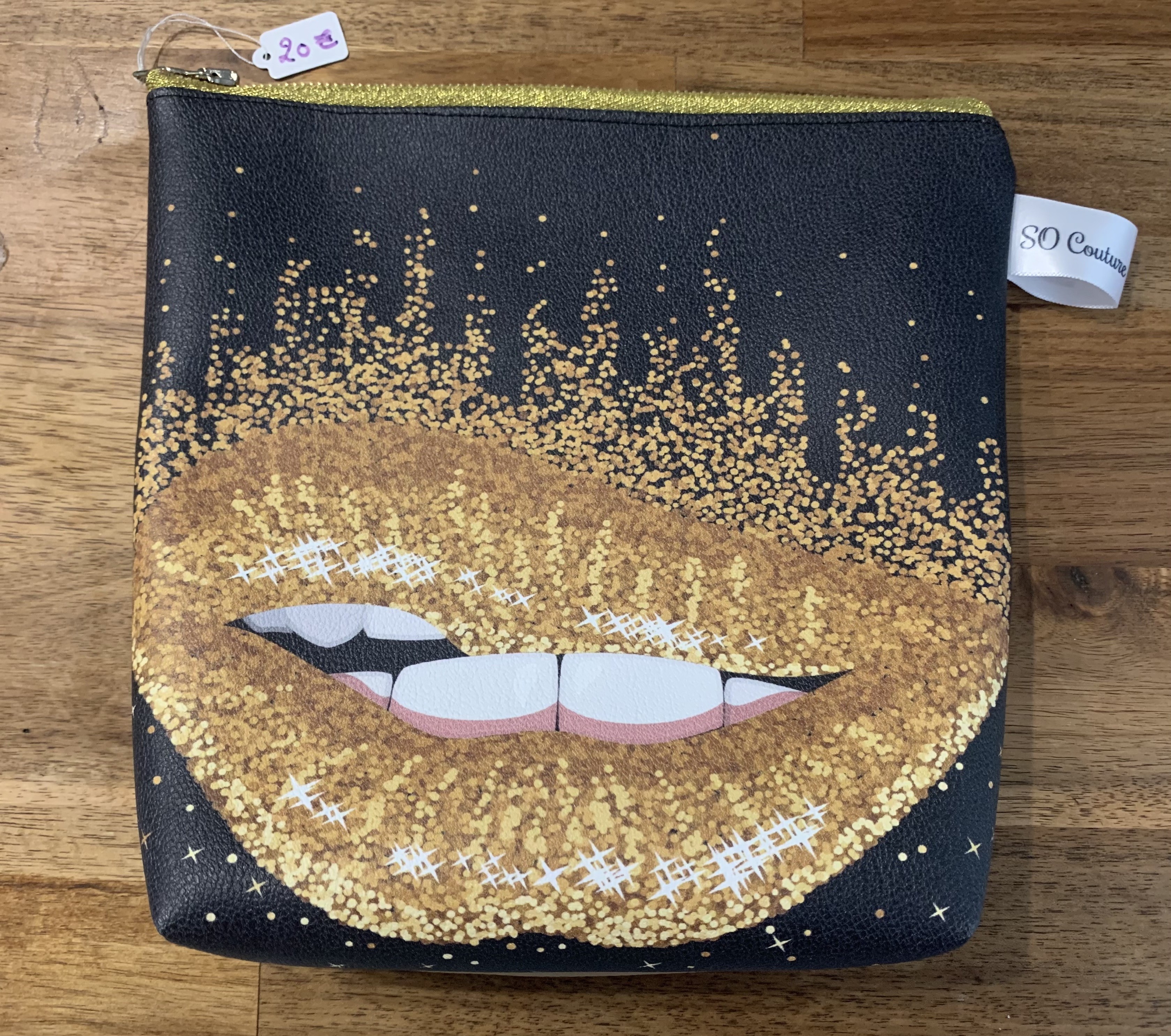 trousse trapèze en simili cuir doré et coupon simili motif bouche noir et doré à l'extérieur , tissu coton blanc motif étoiles beiges à l'intérieur , fermeture éclair dorée curseur tête de mort. 19 cm / 15 cm / 5 cm de fond environ.