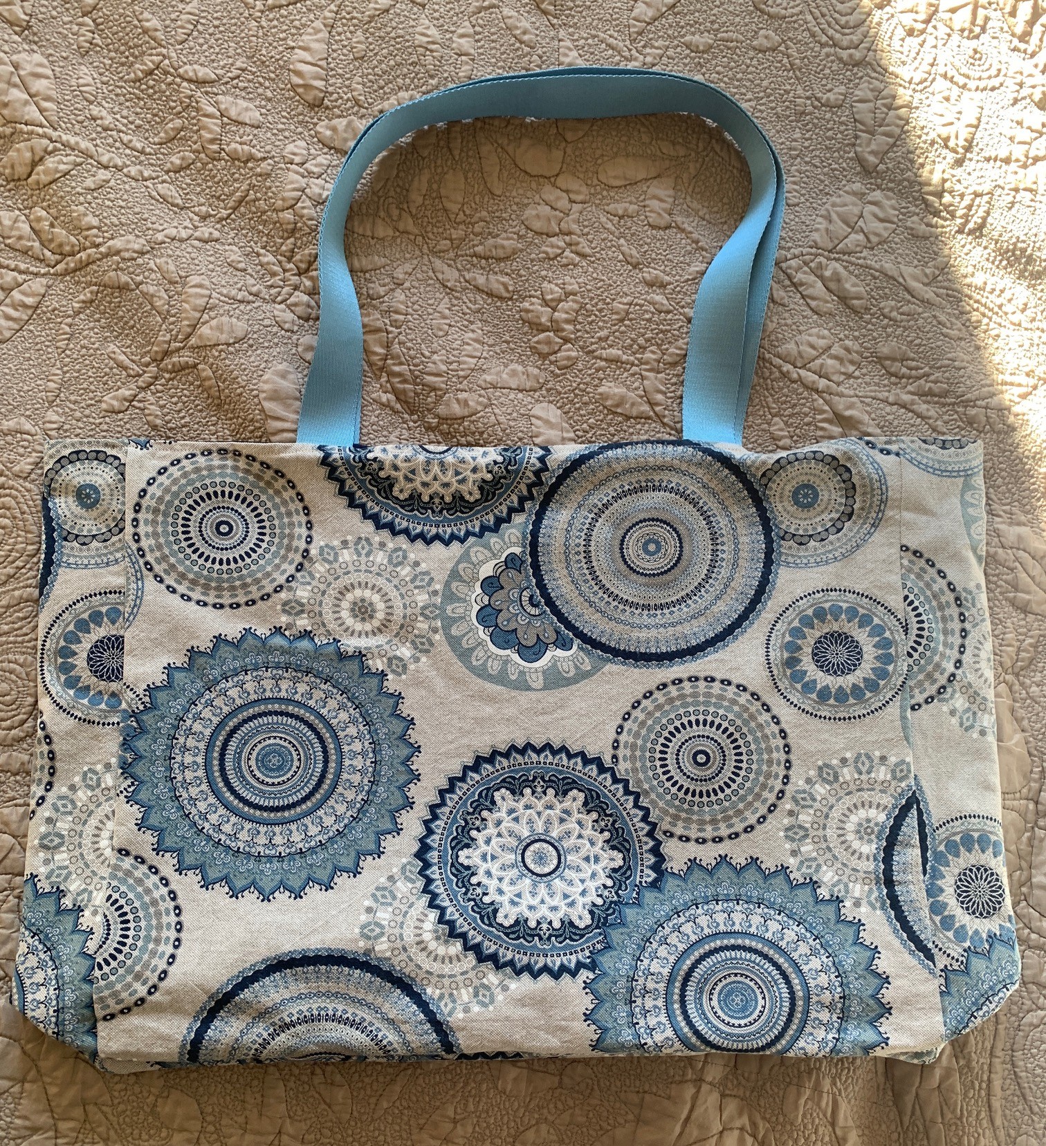 Sac cabas en toile de coton motif mandala bleu sur fond beige et coton bleu marine à l'intérieur, sangle bleu givré. 38/47/11 cm environ.