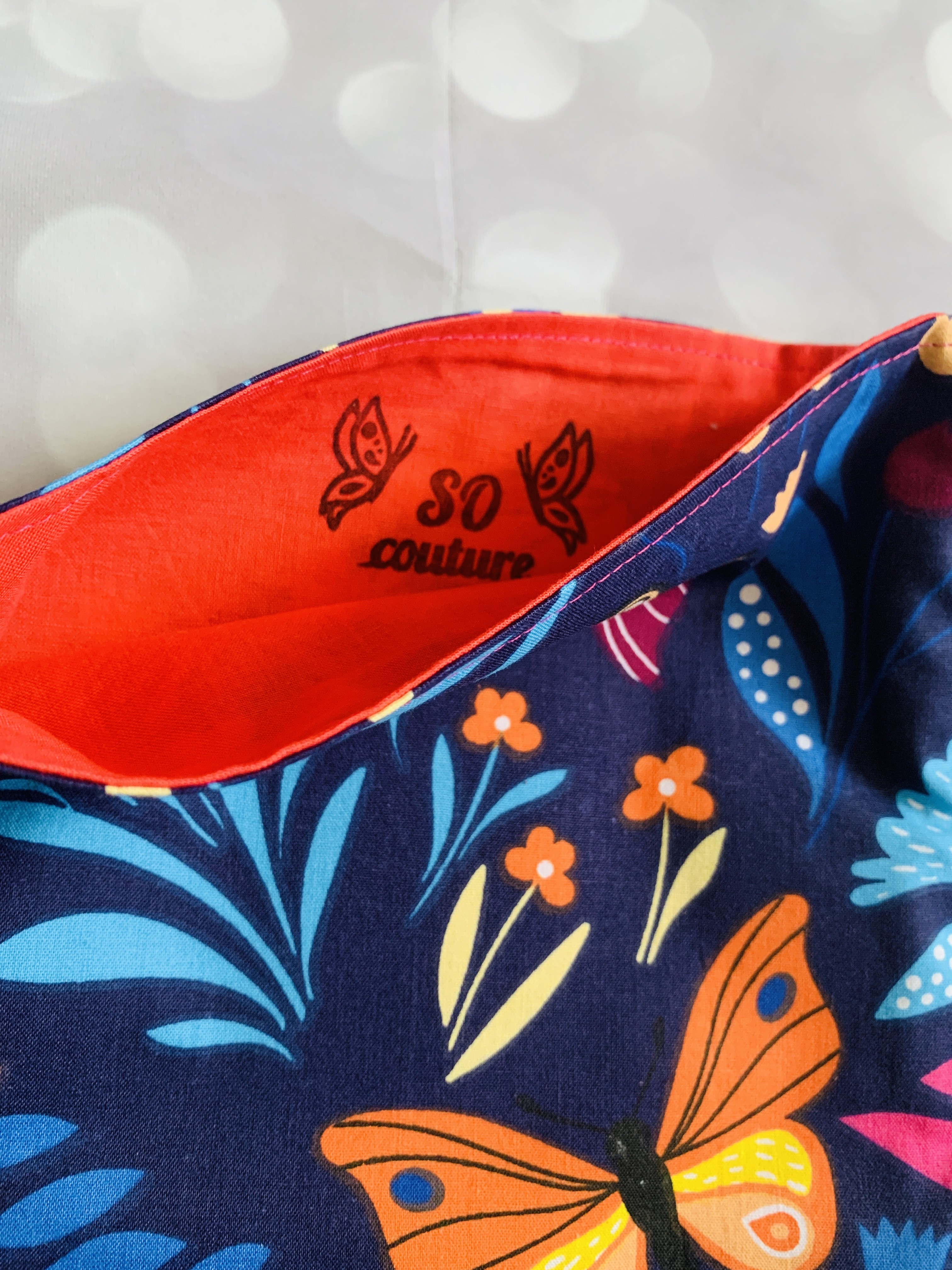 Pochette à livre en tissus coton Oeko-tex motif papillons colorés et uni orange maxi broché, environ 27/20,5 cm.