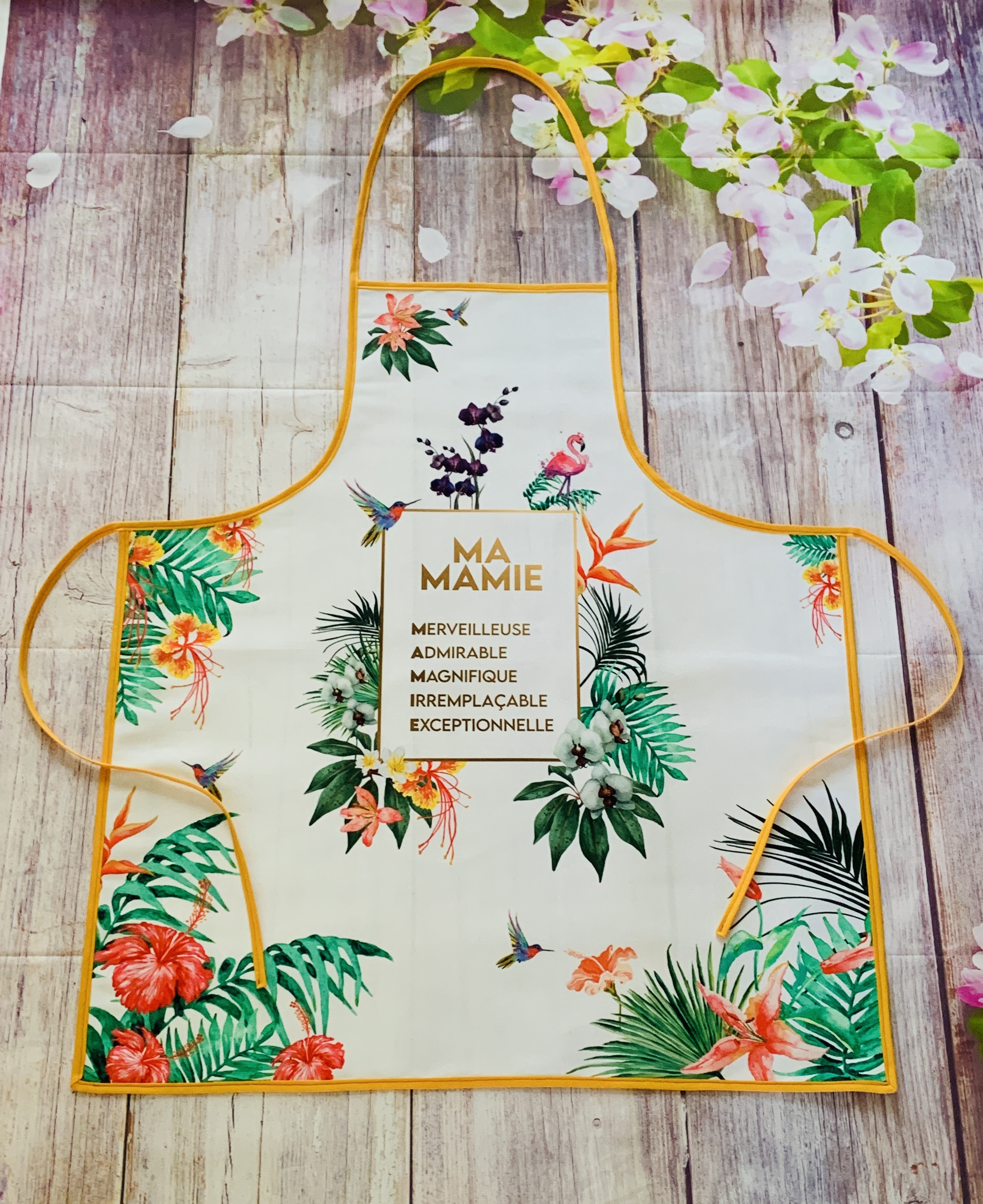 Tablier en tissu anti-taches, imprimé en France avec des encres Oeko-Tex motif tropical thème mamie, finition biais jaune surpiqué rose, fermeture par un noeud.