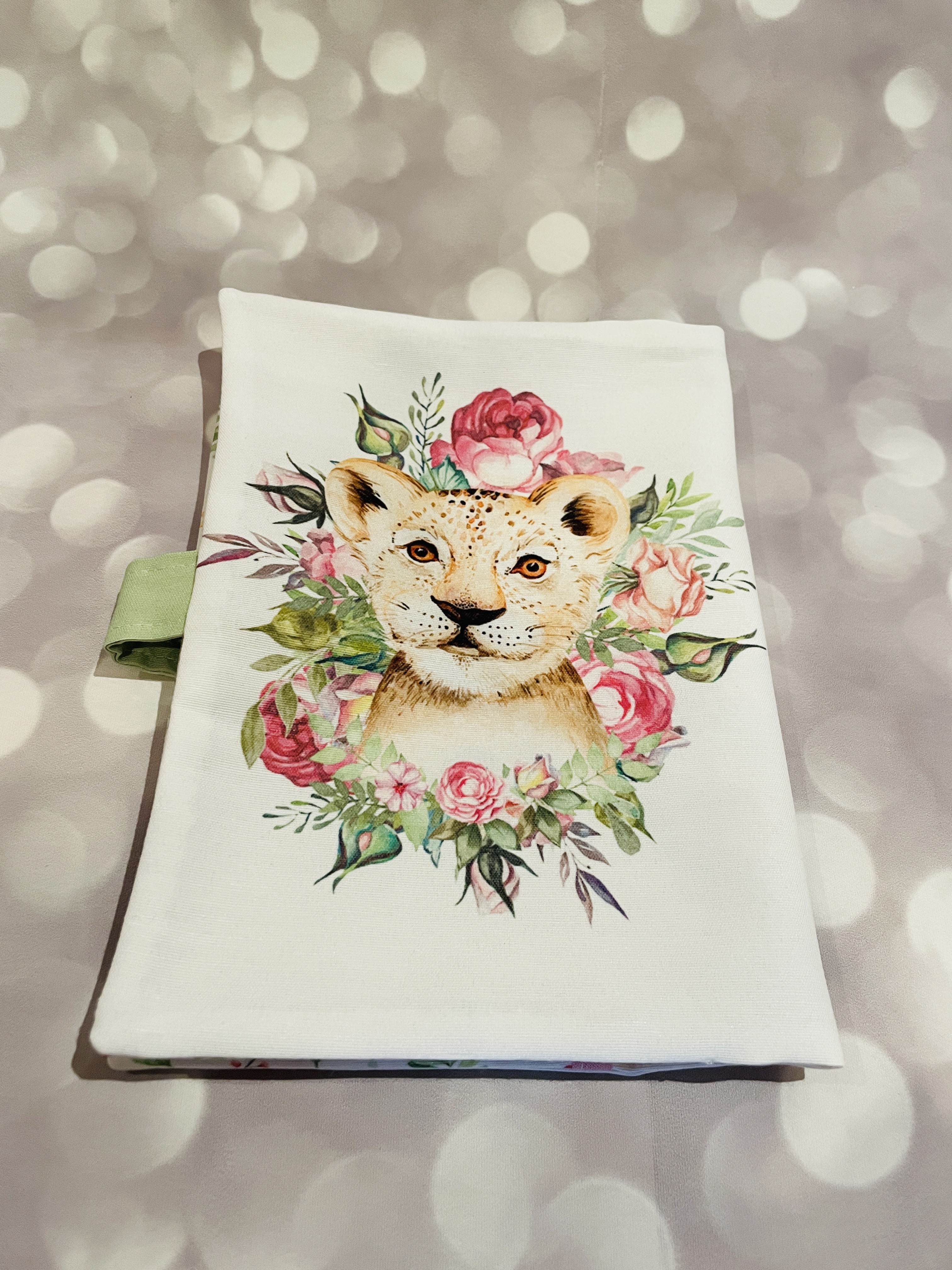 Protège carnet de santé en tissu anti-tâches imprimé en France avec une encre oeko-tex motif lion savane aquarelle.