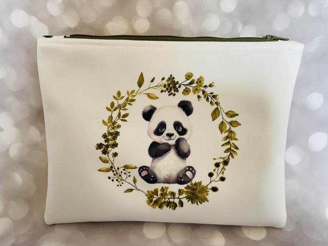 trousse plate en tissu velours imprimé en France avec des encres oeko-tex, motif panda à l'extérieur et tissu coton oeko-tex uni vert kaki à l'intérieur, fermeture éclair vert kaki.