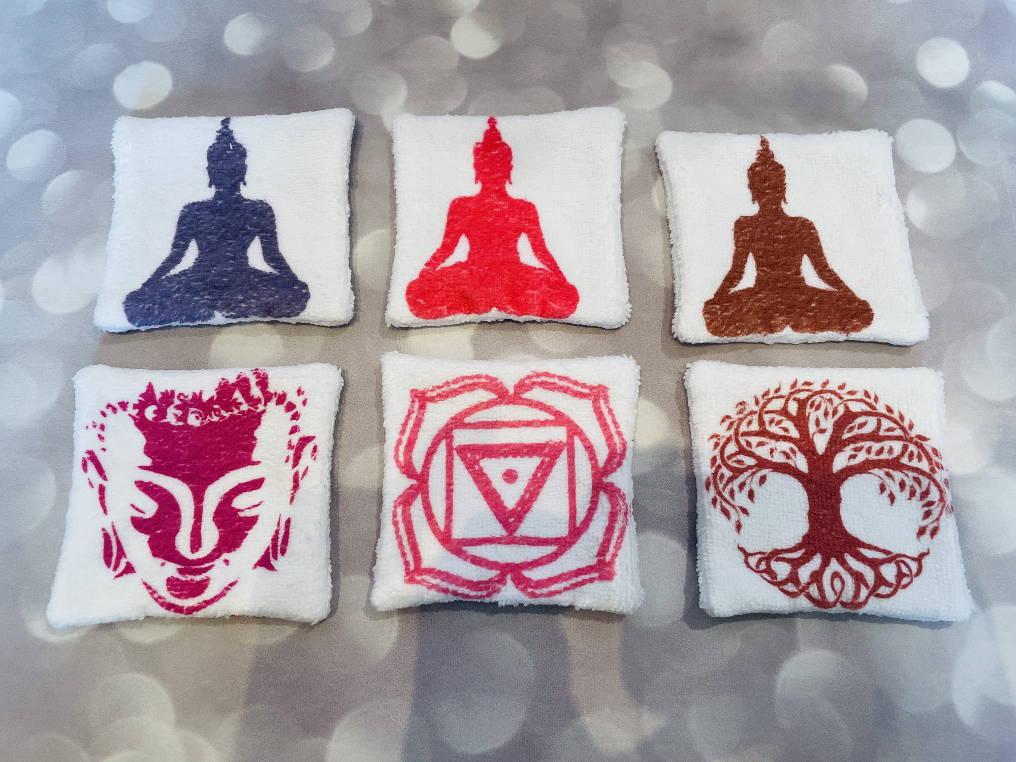 Lot de 6 lingettes lavables en  éponge velours toute douce thème bouddha rose .Tissus Oeko-tex imprimé en France.